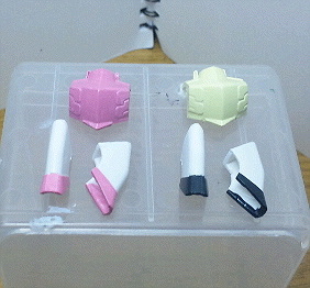 一応キットは2つあるので、今回はそれを利用して春香仕様と千早仕様をコンパチで再現しました。ちなみにピンクの胸と太股が春香仕様、クリーム色の胸と濃紺の太股が千早仕様となります。