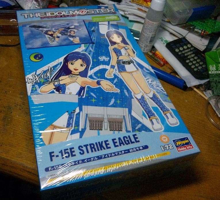 そして本日最大の目玉、「アイドルマスター」とのコラボで「エースコンバット6」にDL限定機として登場した如月千早仕様のF-15E(1/72スケール)。当初ヨドバシで買うつもりでしたが生憎売り切れ(しかも唯一)だったので、まんだらけで安く買ってきました。後悔はし て い な い。