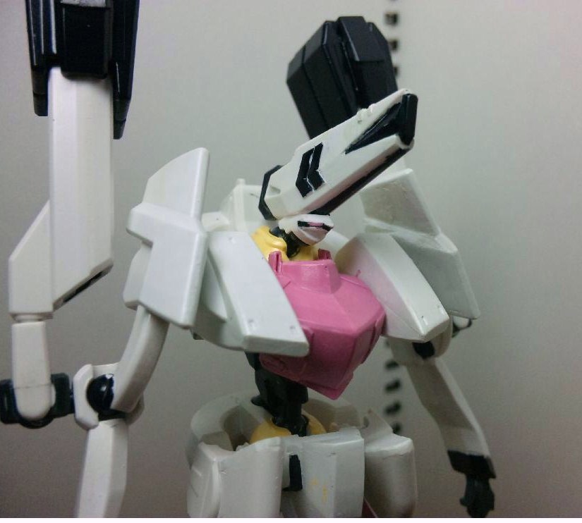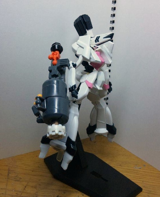 塗装はカラーガイドが無いので箱のイラストやら設定画を参考にしましたが、改めて設定画を見ると胸ブロックの裏面と太股の付け根にあるはずのインテークが無かったりするなど、色々と間違ってる部分が見受けられました。