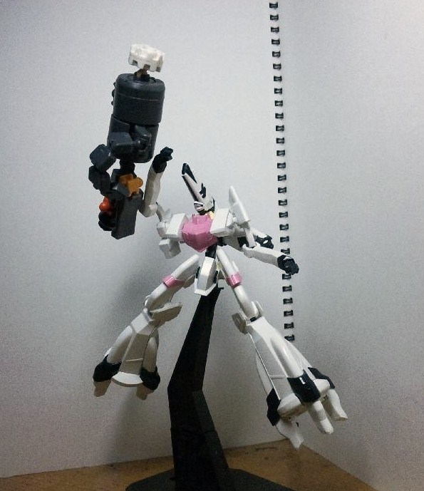 同じ会社の製品「ブロックジョイントプラスチックモデル」とは規格が合うため、こういったオリジナル武装なんかも作れます。ちなみにこの武装のモチーフはビッグオーの腕です。