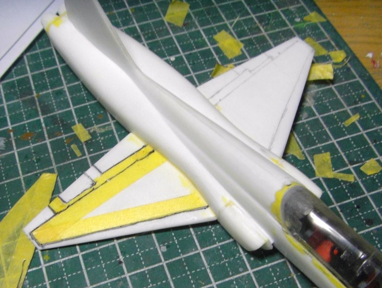 今日からモールドを彫る作業に入りますが、説明書の図とWikiに載っていた図を参考に、マスキングテープでテンプレートを作ってどんどん彫っていきます。