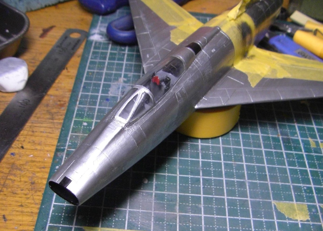 キャノピーのマスキングを剥がしたとき、実際のキャノピーには存在しないはずの窓枠がある事に(しっかりマスキングまでした上で)今更気が付いたので、すぐに1500番と2000番のペーパーと超粗目のコンパウンドでこの枠を削除しました。