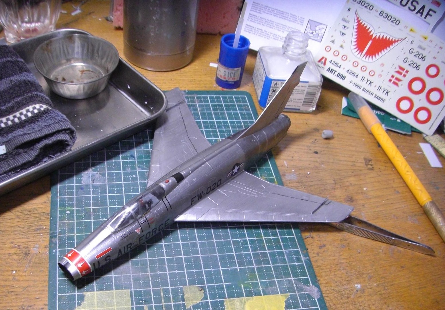 もうあと少しで完成までこぎ着けつつあるF-100ですが、今日は残された最後の難関「デカール貼り」となります。